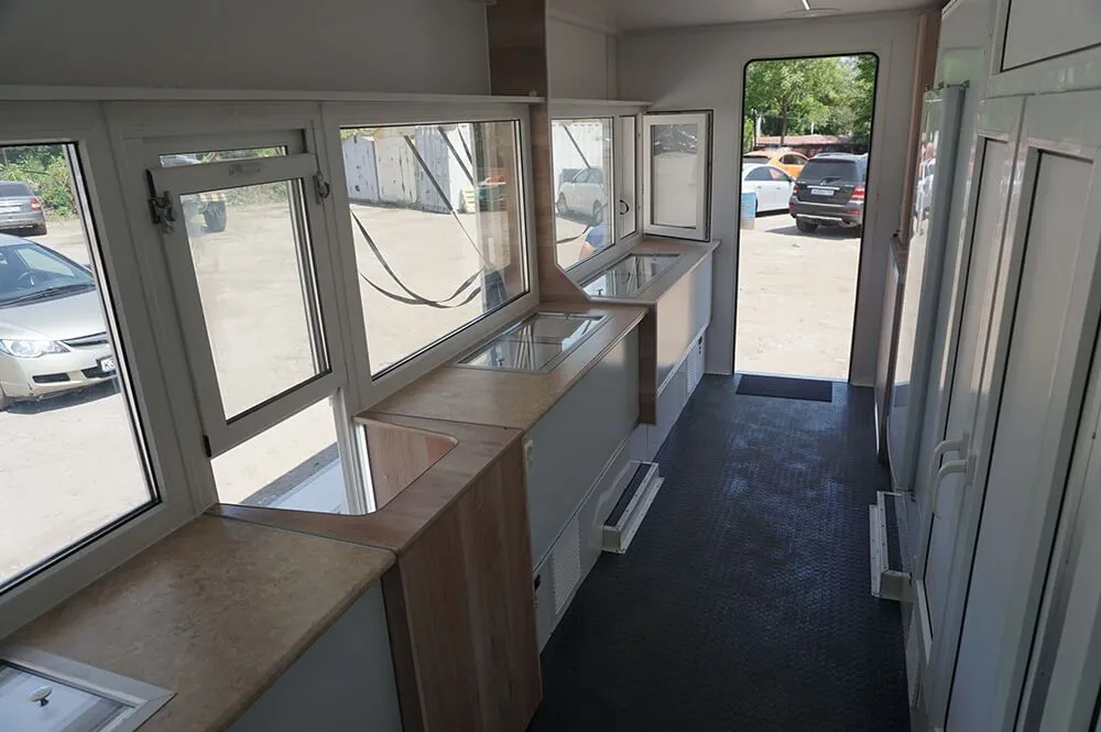 Внутренние размеры фургона 4700х2080х2030 мм или могут быть увеличены. Передвижной магазин представляет собой шасси с автолавкой, которая включает в себя удобный холодильный шкаф с витриной и гардеробный шкаф с дверью. В ДЖАК 80 предусмотрено автономное водоснабжение.